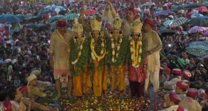 वाराणसी -लक्खा मेलों में शुमार नाटी इमली में भरत मिलाप हुआ। भाइयों राम-लक्ष्मण के स्वागत के लिए भरत और शत्रुघ्न जमीन पर लेट गए। दोनों छोटे भाइयों को देखकर राम और लक्ष्मण रथ से उतरकर दौड़ पड़े। राम और लक्ष्मण ने दोनों भाइयों को जमीन से उठाया। फिर राम ने भरत तो लक्ष्मण ने शत्रुघ्न को गले से लगा लिया। चारों भाइयों के मिलन के बाद मैदान जय श्रीराम के जयकारे से गूंज गया। यह पूरी लीला तेज बारिश के बीच हुई। लीला को देखने के लिए 20 हजार श्रद्धालु छाता लेकर मैदान में डटे रहे। वहीं महाराजा आनंत विभूति नारायण ने श्रीराम को चांदी की गिन्नी देकर आशीर्वाद लिया। कृष्ण कांत शास्त्री ने बताया कि इस बार बारिश के बीच में अद्भुत लीला हुई है। लीला हमने पहली बार देखी प्रभु राम के दर्शन के लिए हर कोई उत्साहित दिखा। काशी में भरत मिलाप कार्यक्रम का आयोजन लंबे समय से हो रहा है। अब यह कार्यक्रम देश ही नहीं, विश्व भर में प्रसिद्ध हो गया है। इस कार्यक्रम को देखने के लिए कई देशों से लोग यहां पहुंचे। यदुकुल के कंधे पर रघुकुल का रथ सवार होता है। आंखों में सुरमा लगाए धोती और बनियान और सर पर पगड़ी लगाए यादव बंधु मैदान में पहुंचे। श्रीराम का 5 टन का पुष्पक विमान को यादव बंधु लीला स्थल तक लाए। इस बार पूरे लीला क्षेत्र में गाड़ियों का आवागमन प्रतिबंधित कर दिया है। 3 ड्रोन के माध्यम से क्षेत्र की निगरानी भी की जा रही थी
