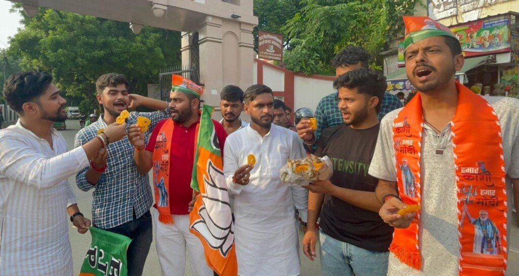 वाराणसी में स्थित बीजेपी कार्यालय के बाहर काफी संख्या में लोग इकट्ठा हुए। वहाँ पर कार्यकर्ताओं ने बड़े उत्साह के साथ पटाखे फोड़े और एक-दूसरे को जलेबी खिलाकर मिठाई बाँटी। बीजेपी समर्थकों ने ढोल-नगाड़ों के साथ जश्न मनाया, जिससे पूरा माहौल उमंग और उत्साह से भर गया।