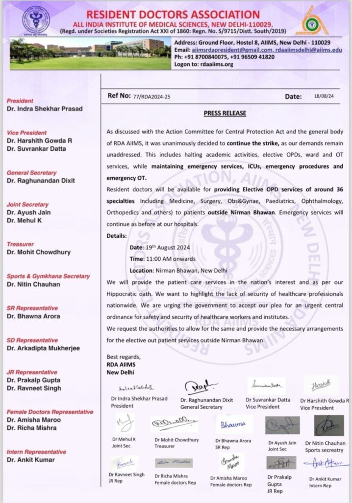 डॉक्टरों का कहना है कि वे मरीजों की सेवा करने के लिए सड़कों पर मुफ्त ओपीडी (आउट पेशेंट डिपार्टमेंट) सेवाएं प्रदान करेंगे। उन्होंने केंद्रीय सुरक्षा अधिनियम के तहत अस्पतालों में सुरक्षा की मांग की है। डॉक्टरों का मानना है कि जब तक उन्हें पर्याप्त सुरक्षा नहीं दी जाती, तब तक उनके लिए सुरक्षित माहौल में काम करना मुश्किल है।
