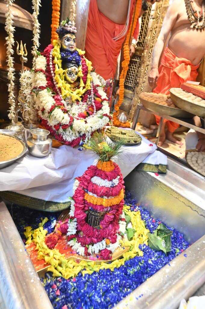 अन्नकूट पर्व के शुभ अवसर पर भगवान श्री विश्वनाथ, माता गौरी और गणेश जी की पंचबदन रजत चल-प्रतिमा की भव्य शोभायात्रा टेढ़ीनीम स्थित महंत परिवार के आवास से प्रारंभ हुई। शहनाई और डमरू की मंगल ध्वनि के साथ “हर-हर महादेव” के जयघोष से गूंजते माहौल में प्रतिमा गर्भगृह में उत्सवपूर्वक विराजमान हुई। इसके बाद गर्भगृह में श्री विश्वनाथ जी की मध्याह्न भोग आरती विधिविधानपूर्वक संपन्न की गई, जिसमें भगवान को विविध प्रकार के भोग अर्पित किए गए।
