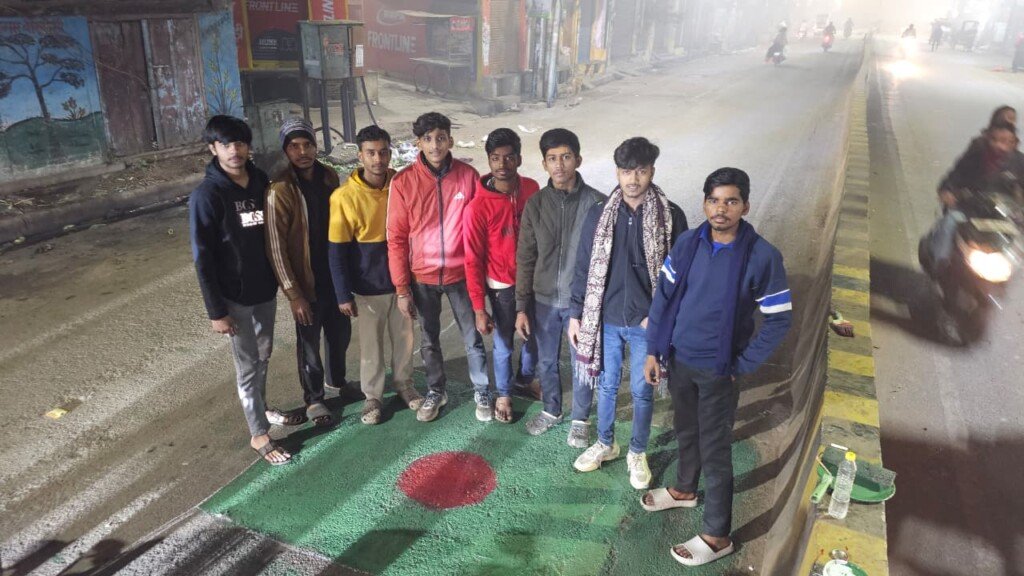 प्रदर्शन के दौरान लोगों ने सड़क पर बांग्लादेश का झंडा पेंट कर विरोध दर्ज कराया और “जय श्री राम” के नारे लगाए।