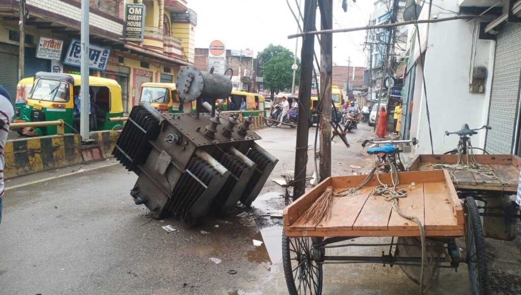 ट्रक में फँसा तार, सड़क पर गिरा ट्रांसफार्मर – हड़कंप