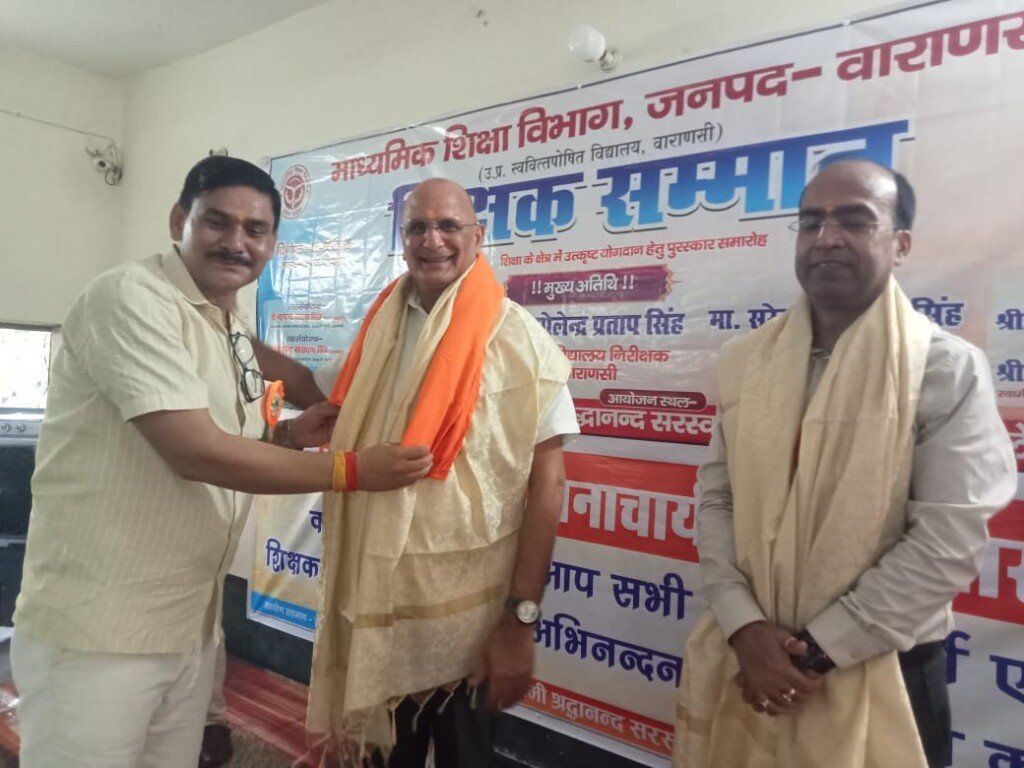 रोहनिया।शिक्षक दिवस पर गोविंदपुर रोहनिया स्थित स्वामी श्रद्धानंद सरस्वती इंटरमीडिएट कॉलेज में संयोजक प्रधानाचार्य देवेंद्र प्रताप सिंह गोपाल की उपस्थिति में शिक्षक सम्मान समारोह कार्यक्रम का आयोजन किया गया। जिसमें मुख्य अतिथि डॉ विनोद कुमार राय अपर सचिव माध्यमिक शिक्षा परिषद वाराणसी तथा भोलेंद्र प्रताप सिंह जिला विद्यालय निरीक्षक ने वाराणसी जिले के विभिन्न कॉलेजों से आए शिक्षकों को अंग वस्त्र व प्रशस्ति पत्र के साथ स्मृति चिन्ह देखकर सम्मानित किया। कार्यक्रम को संबोधित करते हुए मुख्य अतिथि डॉ विनोद कुमार राय ने डॉ सर्वपल्ली राधाकृष्णन के बारे में विस्तार पूर्वक वर्णन करते हुए कहा कि शिक्षक की दर्जा भगवान से बढ़कर होती है हमेशा अपने शिष्यों को अंधकार की ओर से उजाला की ओर ले जाने का काम करते हैं। कार्यक्रम में आए हुए समस्त अतिथियों को प्रधानाचार्य देवेंद्र प्रताप सिंह गोपाल ने अंगवस्त्र के साथ स्मृति चिन्ह देकर सम्मानित किया।कार्यक्रम की अध्यक्षता भरत विश्वकर्मा एवं संचालन उमेश कुमार सिंह तथा देवेंद्र प्रताप सिंह ने धन्यवाद एवं आभार व्यक्त किया की। कार्यक्रम में मुख्य रूप से जयप्रकाश,उमेश कुमार सिंह,नागेंद्र प्रताप सिंह, गौरव सिंह, कौशलेंद्र , संदीप, राजेश, फूलचंद पटेल, संजय प्रियदर्शी, राजकुमार सहित जिले के सैकड़ो प्रधानाचार्य एवं शिक्षक उपस्थित रहे।